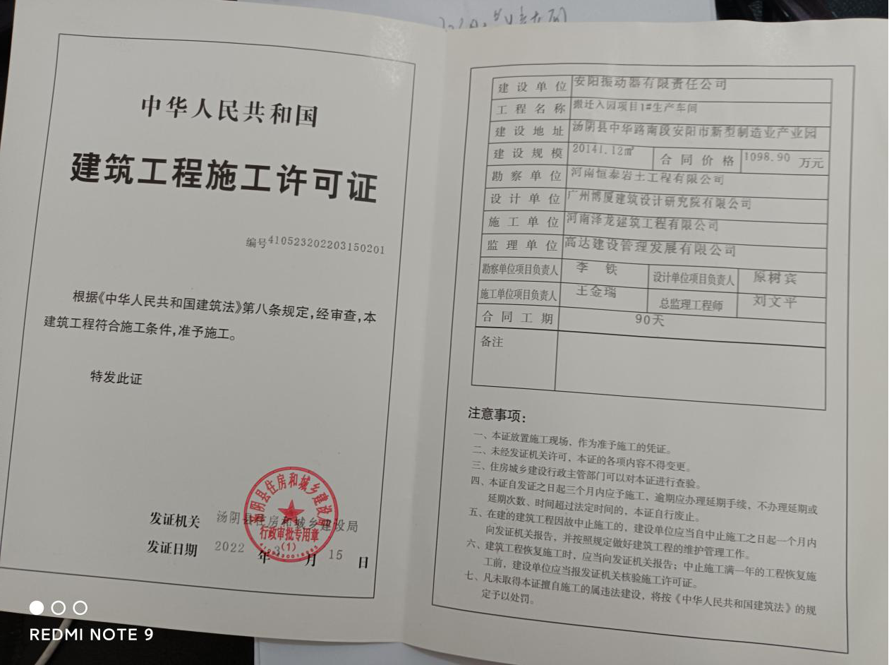 繼2020年9月湯陰·安陽振動器有限責任公司智能制造項目簽約儀式在縣政府第二會議室舉行后。2021年3月4日安陽振動器有限責任公司湯陰新廠建設開工儀式如約進行后,2022年3月15日,安陽振動器有限責任公司獲得新廠建設施工許可證。這將有利于我廠智能制造項目的快速開展。